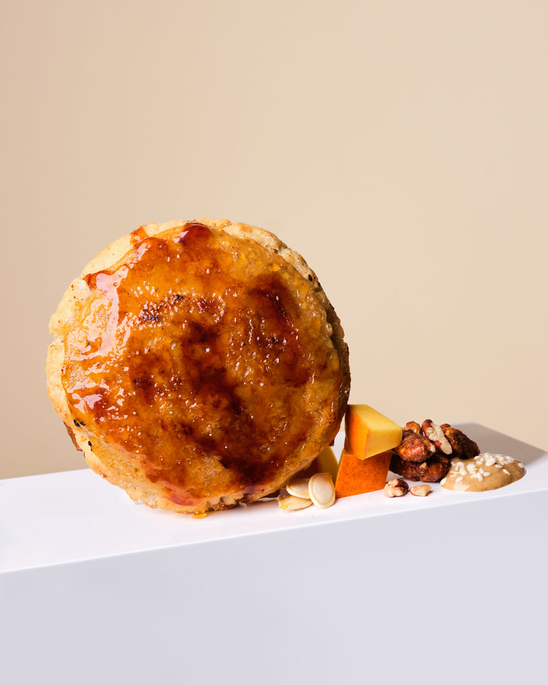 This cookie base, is loaded with pecans and a rich thaini for a depth of fall flavor. Topped with our homemade pumpkin pie Crème brûlée. Best enjoyed the same day, while the sugar holds its hard shell.